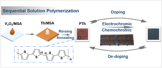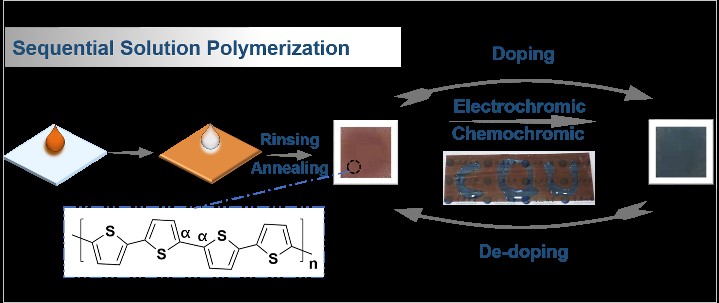 聚噻吩是一种具有共轭长链的导电高分子材料,具有导电性、环境稳定性、非线性光学性质等优异,可广泛运用于太阳能电池、热电器件、电致变色器件等。但由于聚噻吩在溶剂中溶解度极低,极大地限制了其成膜工艺的发展及在器件中的应用。原位聚合聚噻吩薄膜是制备聚噻吩薄膜的一种重要方式,但由于噻吩单体氧化电位高(>1.65 V vs Ag/AgCl),合成聚噻吩薄膜的难度加大。目前原位合成噻吩薄膜常用的方法是电化学合成,通过施加足够...