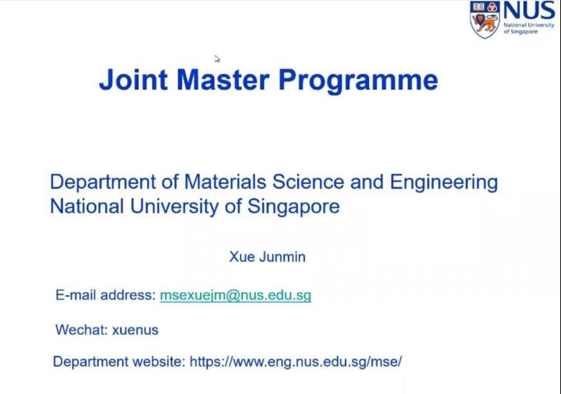 2021年11月30日下午两点半,jn江南通过腾讯会议开展了新加坡国立大学关于“3+2”项目的首次交流会。此次线上交流会议由jn江南李猛副教授主持,邀请到了新加坡国立大学工学部材料公司主管研究生项目的Xue Jun Min教授与有本公司所有意向出国的同学展开交流,帮助同学们深入了解项目,做好提早申请的规划与准备。