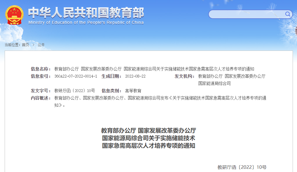 8月31日,教育部网站发布《教育部办公厅 国家发展改革委办公厅国家能源局综合司关于实施储能技术国家急需高层次人才培养专项的通知》。为贯彻习近平总书记关于“四个革命、一个合作”能源安全新战略和我国“二氧化碳排放力争于2030年前达到峰值,努力争取2060年前实现碳中和”的重要讲话精神,落实中央人才工作会议精神和《加快推进急需高层次人才培养行动方案(2021—2025年)》有关要求,充分发挥研究生教育对储能技术急需高...
