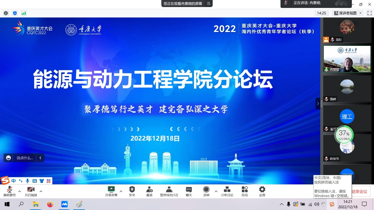 2022年12月18日下午14:20,2022年江南体育官方网站海内外优秀青年学者秋季论坛能动分论坛在腾讯会议举行。新加坡国立大学博士后陶闪闪、香港理工大学博士后潘哲飞、新加坡南洋理工大学博士后韩博、香港城市大学博士后冀秉强、英国谢菲尔德大学博士后黄小雪、英国帝国理工大学助理研究员、北京理工大学在读博士王东方等7名优秀青年学者作为受邀嘉宾,通过学术报告的方式,为公司师生带来了一场学术盛宴。分论坛由公司冉景煜书记主持。冉...