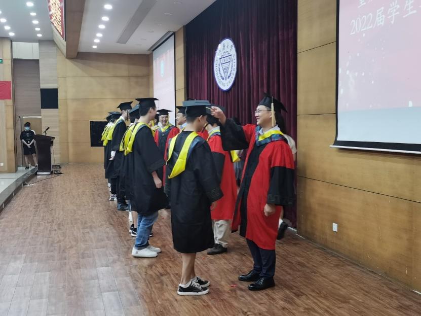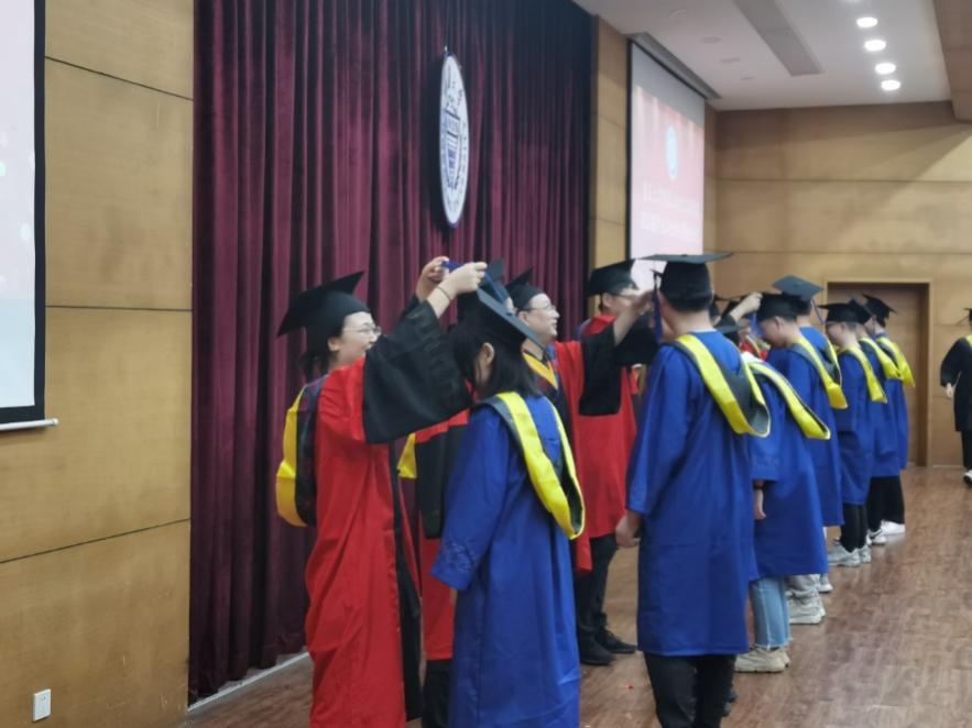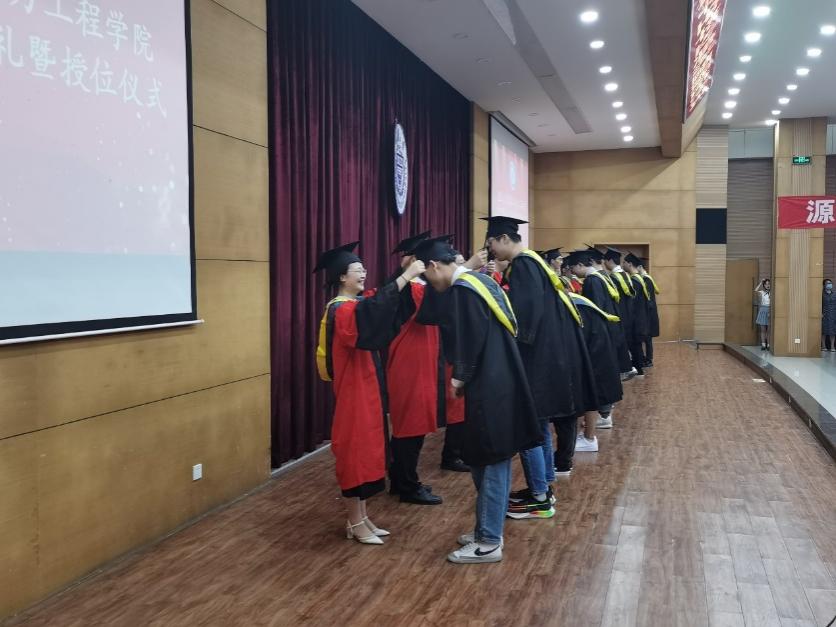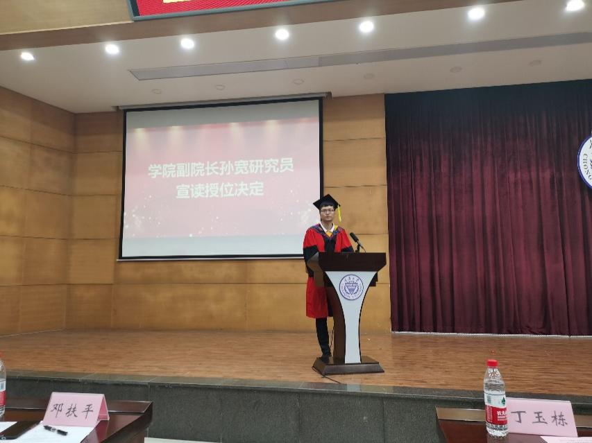 公司副经理孙宽研究员宣读授位决定后,毕业生依次上台接受公司老师们拨穗正冠、授予学位证书,并合影留念。