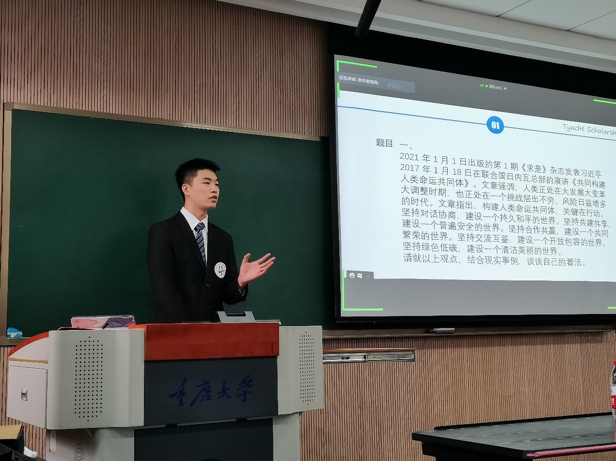 王泽晨选手展示了他优秀的学习成绩和丰富的实践经历,他曾负责策划组织过多次活动,同时也会摄影、剪辑视频,寻求多方面的发展。其即兴演讲主题是“人类命运共同体的构建”,他就马尔代夫水下会议引入话题,解释并批判了关于发达国家与发展中国家碳排放“一刀切”的思想。