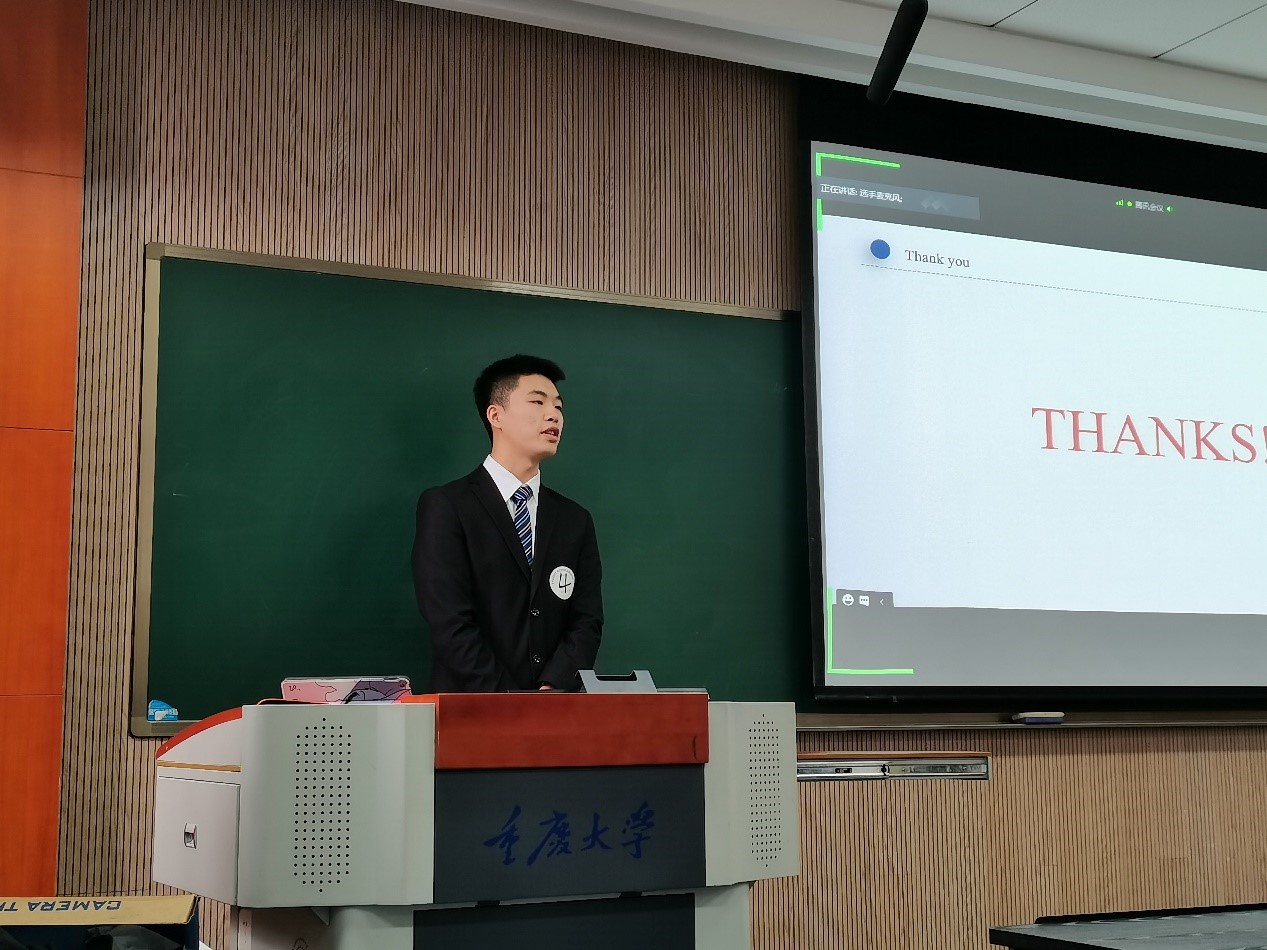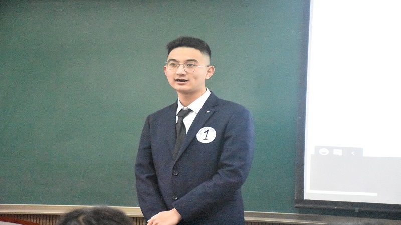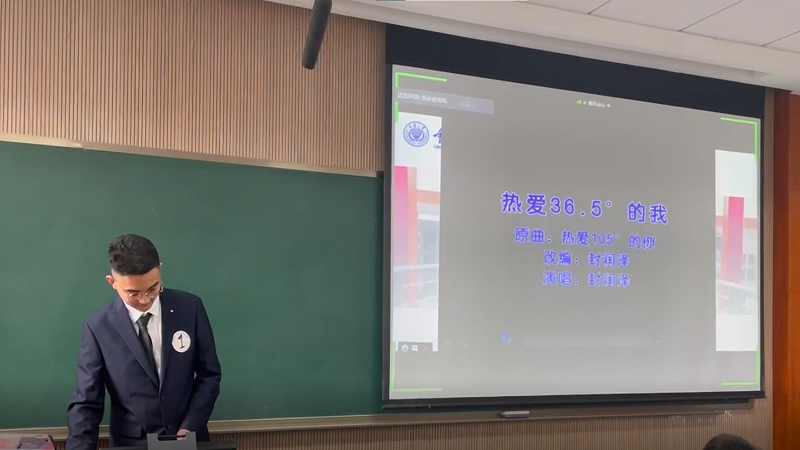 首先上台的是封润泽选手,他一上场就为我们带来了一首原创改编歌曲《热爱36.5。的我》,伴随着歌声以图片的形式展现了自己在学习、科研以及实践等方面的取得的成绩,现场气氛也变得活跃轻松起来。其抽选的即兴演讲主题是“对知识付费的看法”,他就事物的两面性展开演讲,提到了课堂听课效率以及课后查漏补缺的有益结合,以及过分依赖网络教学的不良影响。