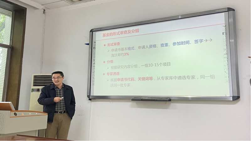在讲座中,谢开贵教授先从“基金的评审”、“基金的结构和考察重点”、“基金的策划”三个方面介绍了在基金撰写前应该如何从专家评审的角度去策划、选题以及搭建基金申请书框架。之后,谢教授重点介绍了 “基金的撰写”,对项目名称、摘要、立论依据、研究方案、项目特色与创新之处等几个板块的写作要点和技巧进行了详细的讲解。讲座最后,谢教授鼓励大家“要勇于申请,勇做分母,长期战斗,做好规划”。