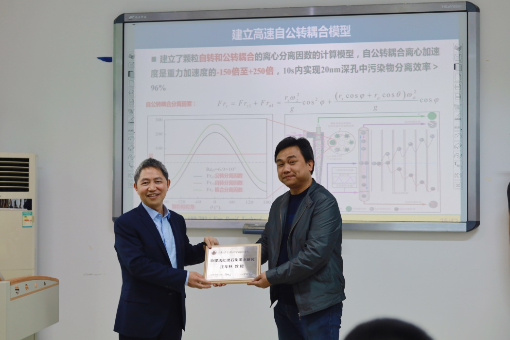 讲座开始前,李俊教授向参会师生介绍了汪华林教授,并向汪教授的到来表示热烈欢迎。汪华林教授在讲座中首先介绍了新成立的“华东理工大学碳中和未来技术公司”,并对华东理工大学发展史进行了简要介绍。之后,汪教授从“新需求”、“新思路”、“新实践”三个方面,围绕减污降碳协同关键核心技术攻关难题,介绍了华东理工大学“以物理法为主”的石化废水处理工艺新进展。汪教授对“颗粒高速自转规律”、“颗粒自公转耦合表征”、“颗粒微界面震荡调控”等三个基础理论研究,“非化学药剂破乳”和“非相变废液/油泥干燥”等两个变革性技术及其工程应用进行了详细的讲解与探讨。