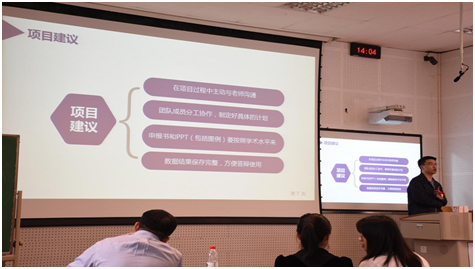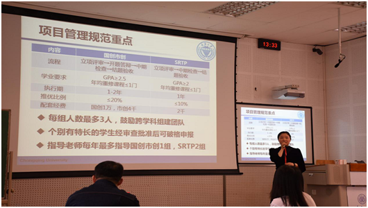 于佳佳副教授介绍了创新项目评审以及创新项目执行的相关信息。他首先向同学们介绍了他所在团队的科研项目,研究方向等。于老师讲到了科研创新项目的意义,创新创业项目的灵魂在于创造创新以及实践,他强调创新是发展的润滑剂,而国创、市创和SRTP这样的项目和活动对于老员工来说是尤为可贵的增强科研能力机会。同时于老师着重向同学们介绍了创新创业项目的评审制度,并且从评审专家角度和员工角度向同学们传授了许多答辩技巧。