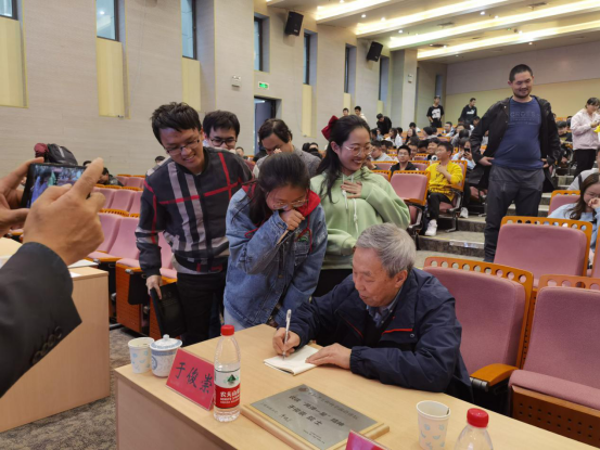 于院士表示他更愿意用小故事,来为我们阐释两弹一星精神的具体内涵。于院士讲述刚开始核研究小组人员都是从各单位抽调的,他们关于核研究领域的书籍也是极少的,至于计算,当时只有一台只能进行加减乘除的电动计算机,他们多是靠手算完成。并且工作地环境的恶劣,但是小组却异常团结、非常拼命,于院士讲到一位女同事放下自己哺乳期的孩子前往北京工作的故事也打动在场的师生。