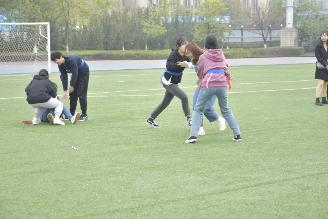 第一个项目是抓住快乐的小尾巴,游戏规则是参赛选手在腰上系一条粘有8条带子(尾巴)的绑带,每班参赛选手在保护好自己尾巴的同时去扯掉别班参赛选手的尾巴,现场一片欢声笑语,朝气蓬勃。