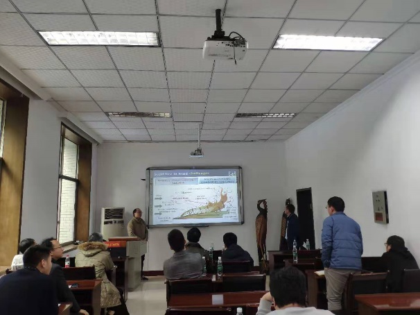 胡隆华教授以“环境风作用下火灾扩散燃烧与火焰行为”为主题带来精彩的学术报告。胡隆华教授首先讲述了其团队的研究进展,包括环境风速对于液体燃料油池火的燃烧和火焰特性影响机制与理论模型、气体燃料射流火在环境风作用下的火焰参数演化规律,并对未来的工作进行了展望。他表示,对火灾的燃烧特性进行深入的研究能帮助人们更充分的了解火灾时火焰传播和演化规律,是火灾安全的科学领域重要一环,具有非常深远的研究意义。胡隆华教授的报告生动有趣、条理分明,为在场师生充分开拓了学术视野。在场同学踊跃提问,胡教授耐心作答,为同学们排疑解惑。报告最后,苟小龙教授向胡隆华教授表达感谢并颁发纪念讲牌。