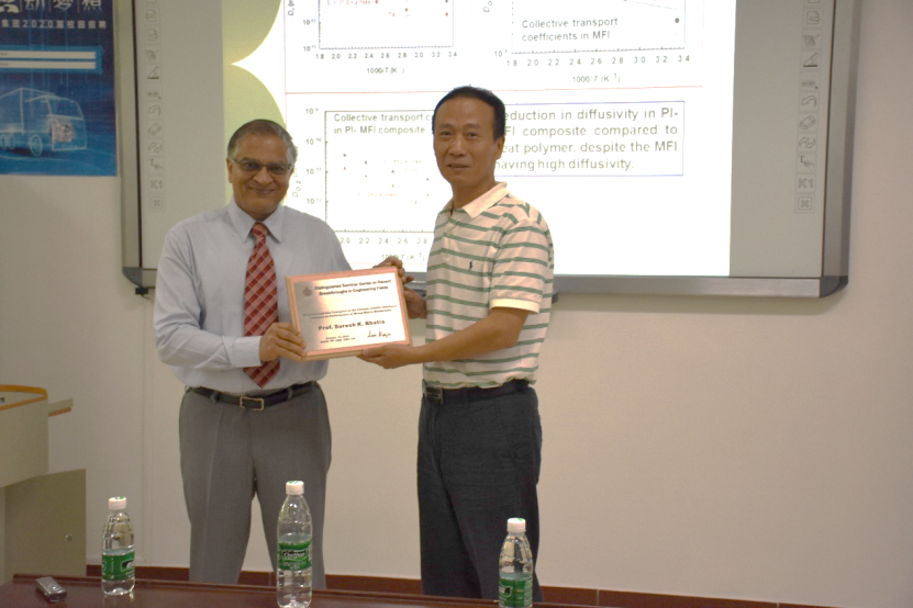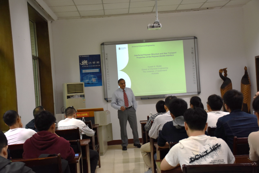 Suresh K. Bhatia院士进行了关于“Structure and Gas Transport at the Polymer-Zeolite Interface: Influence on Performance of Mixed Matrix Membranes(聚合物-沸石界面结构和气体输运:对混合基质膜性能的影响)”的学术报告。此次学术报告由刘浪研究员主持,jn江南刘朝、孙宽、徐肖肖教授、李期斌副教授,资源与安全公司韩乐研究员,土木公司刘鲁萌老师等40余人参加了此次报告。