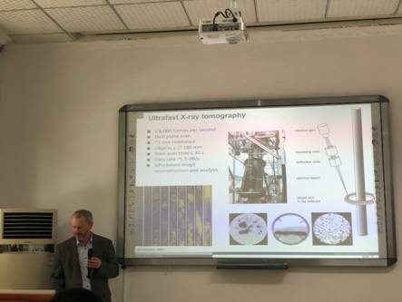 Hampel教授的学术报告内容丰富,讲解形象生动。首先,Hampel教授介绍了德国HZDR研究院以德累斯顿工业大学的主要信息和工作生活环境,使得在座师生扩展了眼界。然后讲述了团队研究中涉及的两个热工水力台架。随后介绍基于这些台架进行的反应堆热工水力相关实验并着重介绍丝网探针技术以及高速X射线成像技术在实验中的应用。通过介绍测量装置、测量原理,图像重构方法以及不同测量方法的适用条件,让同学们对这些先进两相流动探测技术有了深入的了解。此外,Hampel教授还介绍了其在两相流动机理研究和化工领域内的应用及研究成果。
