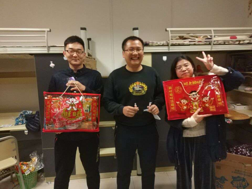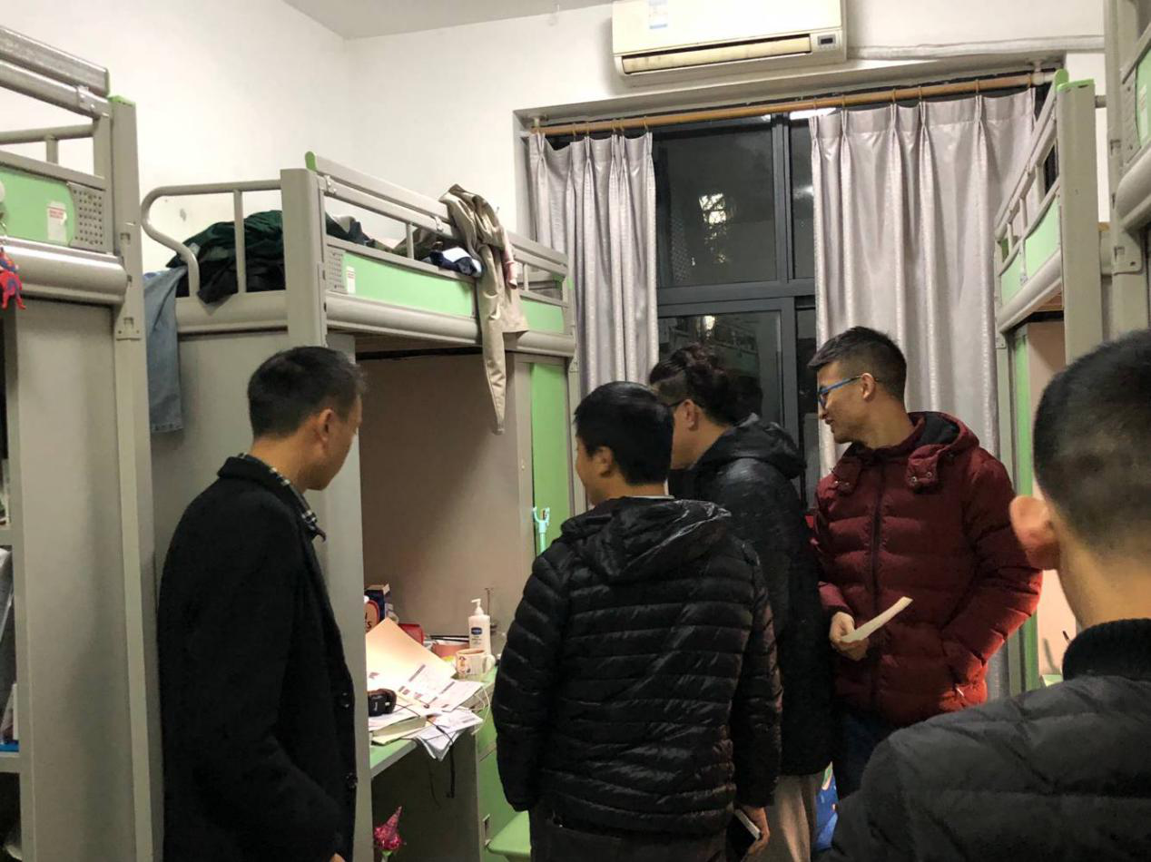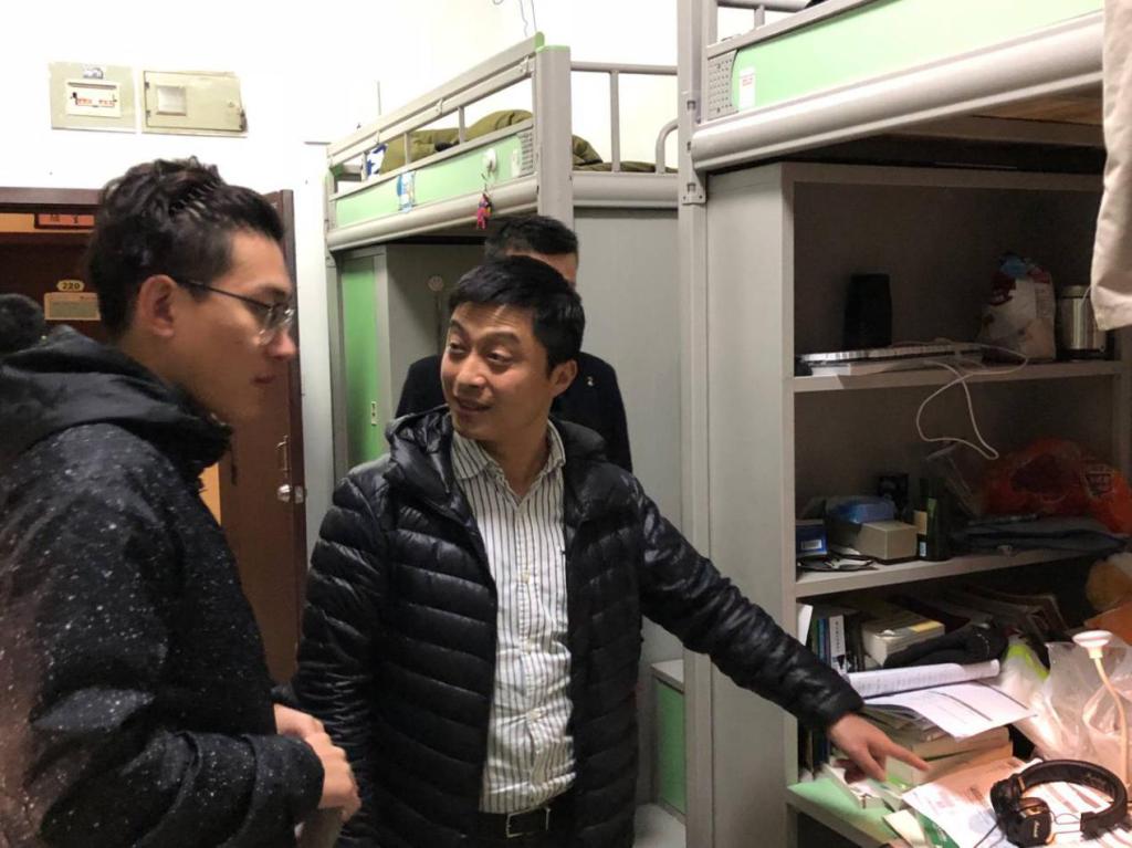 紧接着,徐方正书记和李定超来到了梅五的男生宿舍亲切的问候大家,提前祝大家元旦快乐。徐方正亲切的询问同学们的生活学习状况,他认真地听完后,向同学们表达了他的新年祝福,并且预祝大家在期末考试中取得一个好成绩。李定超老师也带着给同学们准备的零食礼物一起看望大家。梅五宿舍楼里充满了欢声笑语。