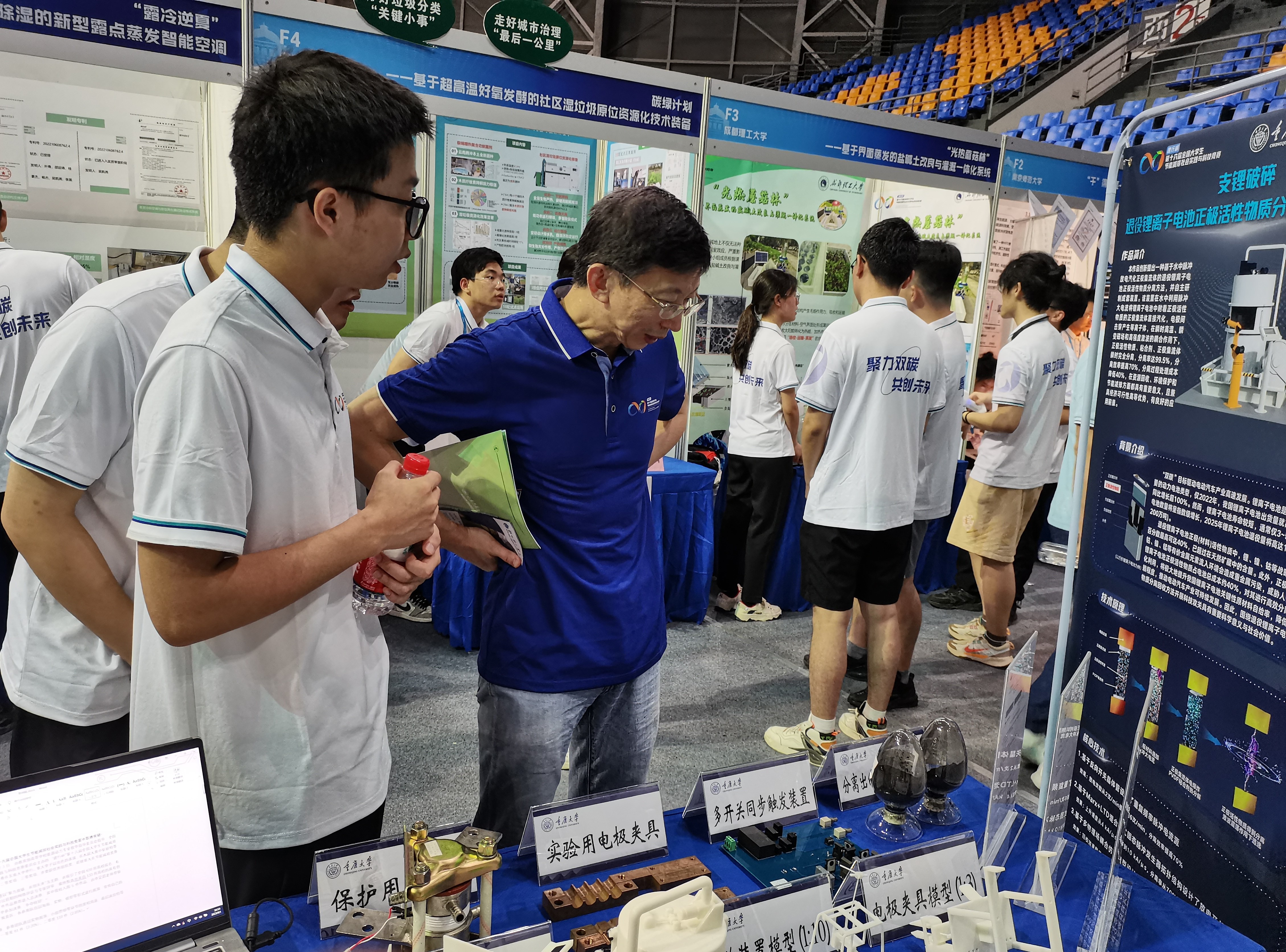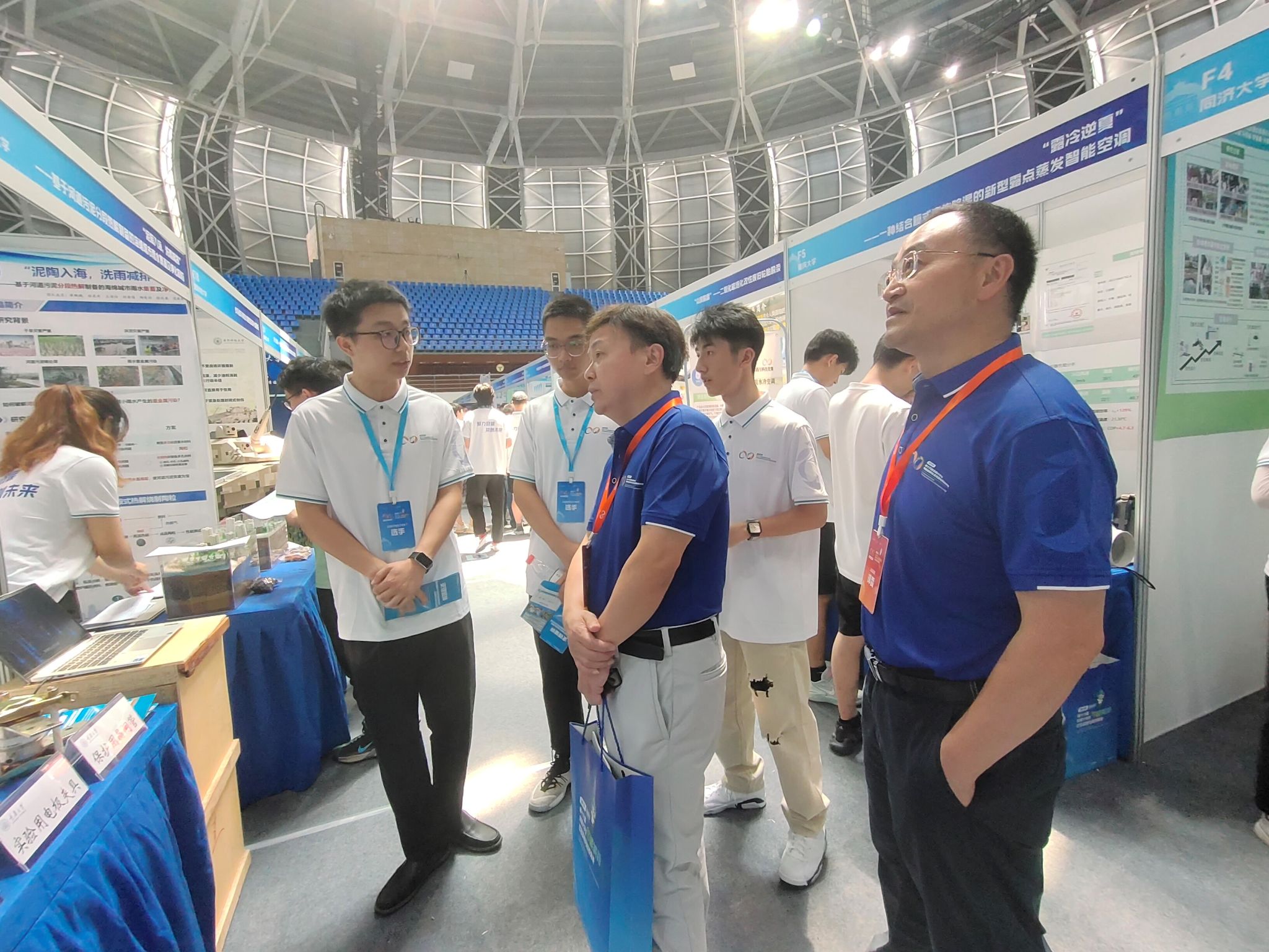 决赛现场设置了展览区,各参赛队伍以海报、实物、模型等形式进行展演,宣传自己的作品,作品内容涉及能源、环境、机械、建筑等多领域,充分体现了多学科交叉融合的竞赛发展理念,261件作品的展演构成了一场盛况。专家评委也来到现场对感兴趣的作品进行参观考察,来自不同专业的选手们用自己的专业知识向专家介绍自己的作品,展现自我。