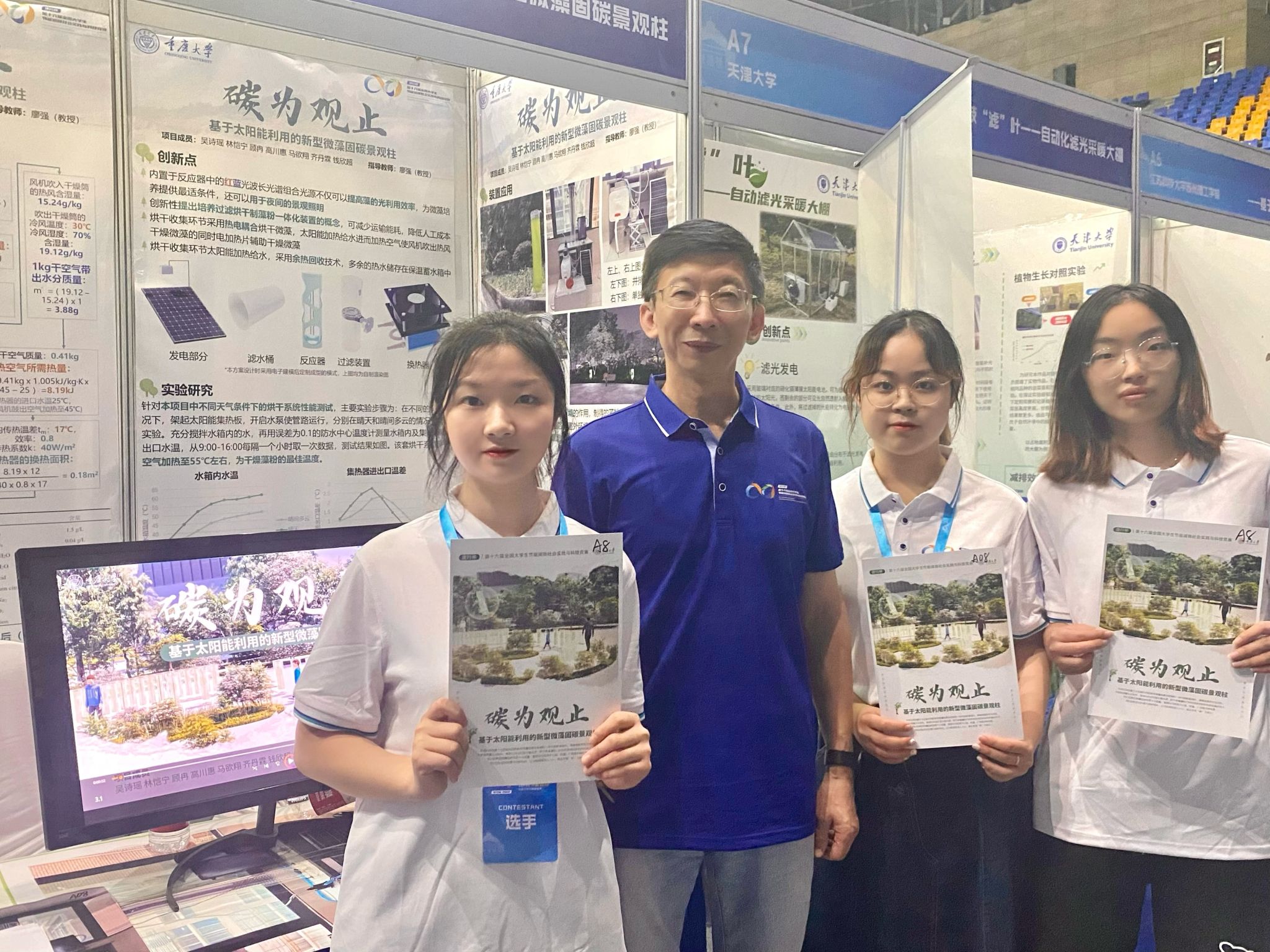 为了响应国家政策,团队成员吴诗瑶、林恺宁、顾冉、高川惠、马欲翔、齐丹霖、钱欣超等设计了一种利用太阳能发电储能、集微藻培养过滤干燥制粉于一体的景观柱,兼有普及大众节能减排意识的作用。该作品的创新点在于首次提出了基于太阳能利用的新型微藻培养采收制粉一体化固碳景观柱的概念,烘干藻粉的过程中创新性地采用了余热回收及热电耦合方式,柱式微藻反应器中间装有红蓝光交替的内光源管,将微藻生长特性与柱体美化相结合,既有助于促进微藻的生长,也具有景观作用,应用场景广泛,普及减排观念,达成“碳”为观止。