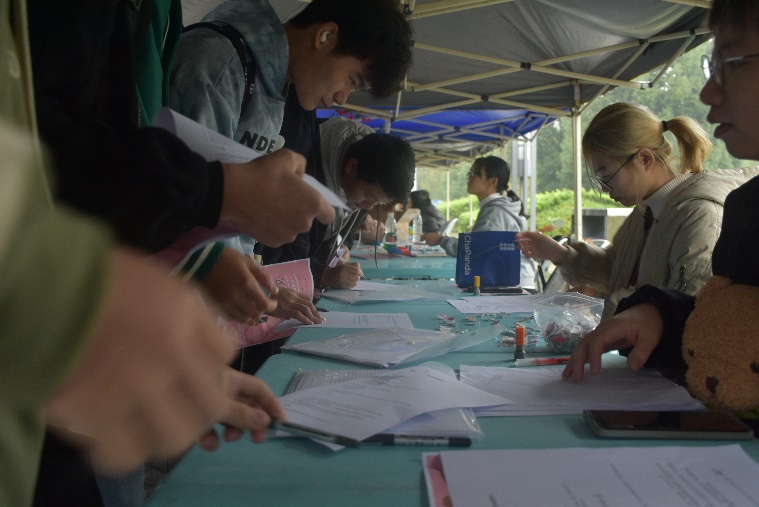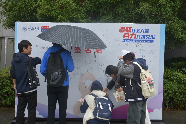 “有爱·防艾”宣传活动以游戏的形式展开,旨在通过寓教于乐的方式加强员工们对艾滋病相关知识的了解。为了传递温暖,许多同学甘冒小雨在留言墙上签下自己的名字,诉说着在抗“艾”路上无惧风雨、携手同行。活动虽然受到了天气影响,但淅淅小雨阻挡不了同学们的热情,公司员工组织的馆外宣传活动依然吸引了大批同学积极地参与进来。本次活动不仅宣传了艾滋病防控知识,也鼓励着同学们关爱艾滋病感染者和病人,众志成城、共抗艾滋。